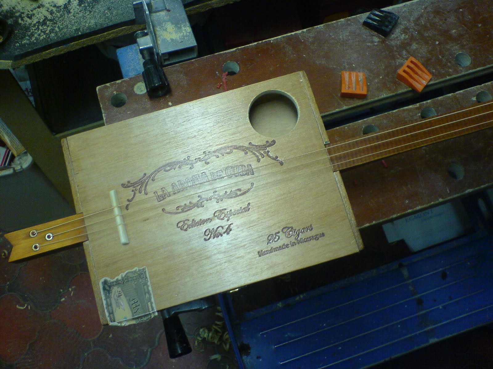 Og av den grunn blei det bygd ein ny gitar av ein sigarboks av tre, med ein hals av tre og med strengar tre. Nokon vil sikkert hevde at det er ein treskalle som bygger dei og, men den diskusjonen kan me ta ein anna gong.
